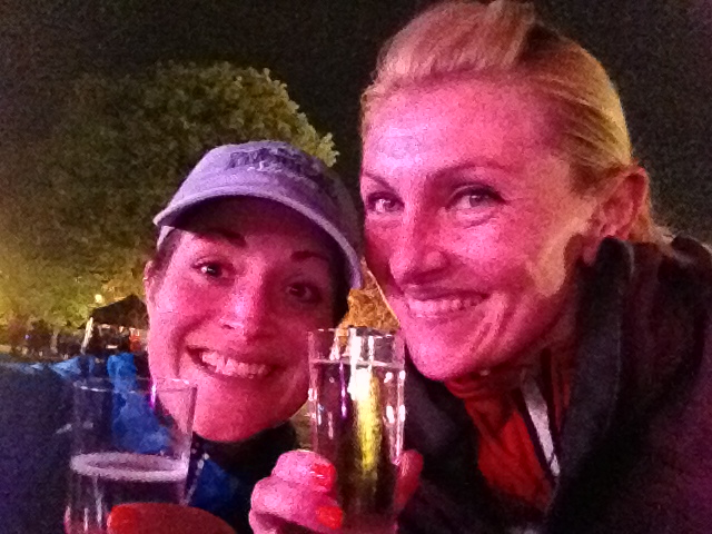 I usually cross the finish line desperately looking for water and being made to wait,  today water was in my hands in seconds, followed by 2 bottles of coconut water then a glass of prosecco. Yeah, the water can wait, I want the bubbles! It was like walking into a party where the waiters greet you with glasses of champagne on a tray, except I wasn’t looking so glam, and the glasses were plastic. Fabulous, fabulous, fabulous!