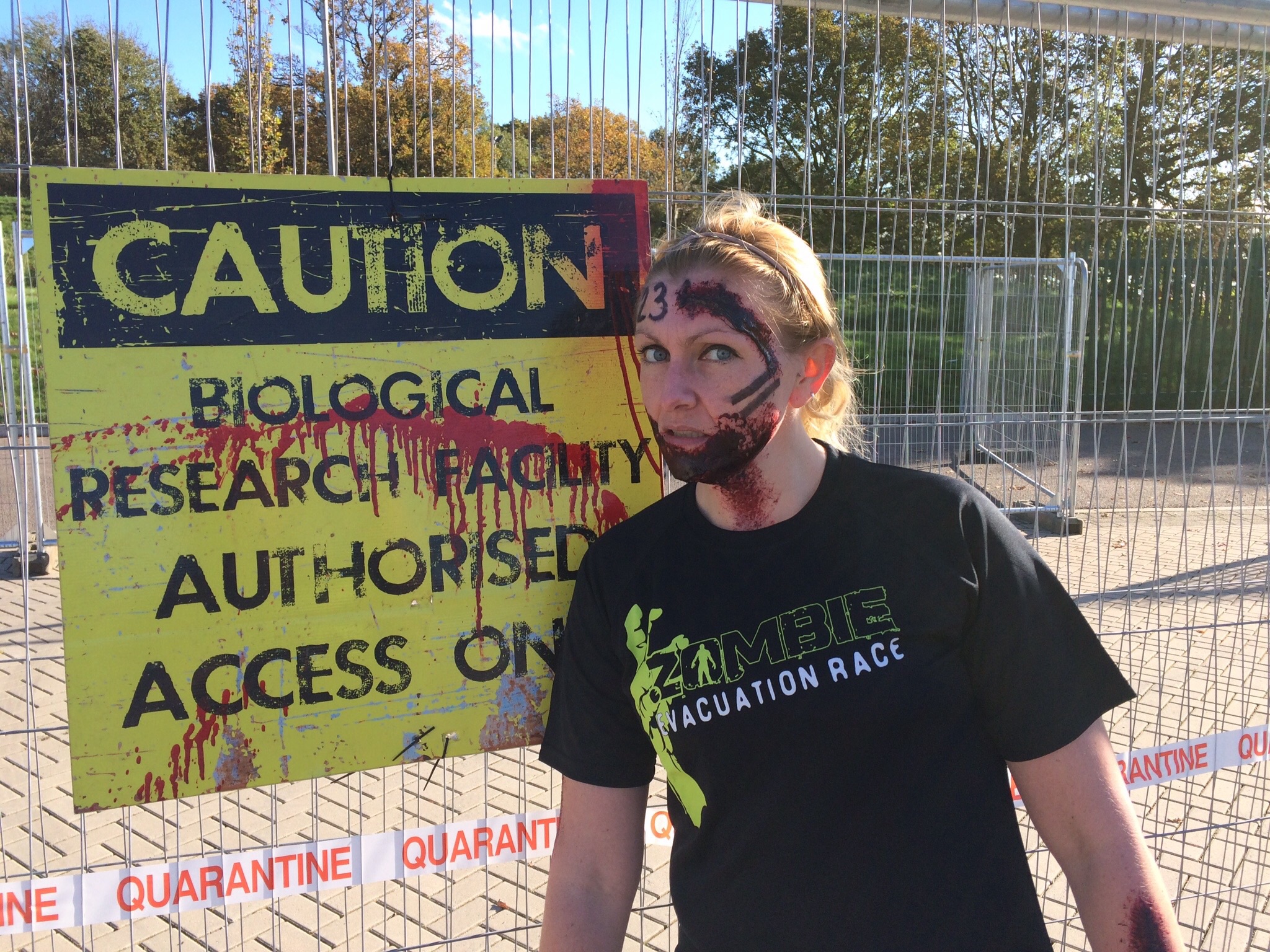 The race organisers did a great job getting everyone in the mood – a Sargent from Majesty’s RAZORS (Royal Army Zombie Outbreak Response Squadron, obvs) explained that as of 0700 hours the UK Mainland had been placed under quarantine due to a zombie outbreak.  We were warned that we should not engage in any physical contact with the zombies as the infection was highly contagious and we should proceed directly to the evacuation zone – uh oh!