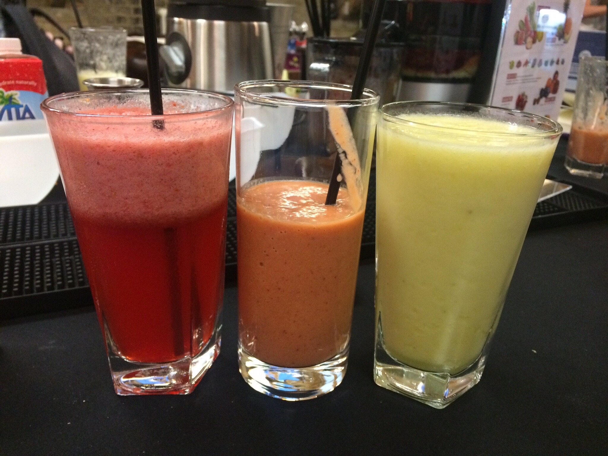 We then moved on to a vegetable based drink called the Booster. We juiced 3 large celery sticks, 3 carrots and a pack of 4 ready prepared beetroots, this was then added to the blender with an avocado and more ice. Apparently pre-packed cooked beetroots aren’t the best for juicing as they are so soft so they turn to pulp very quickly so we added another one straight into the blender. If you’re going to juice beetroots, raw ones are best!